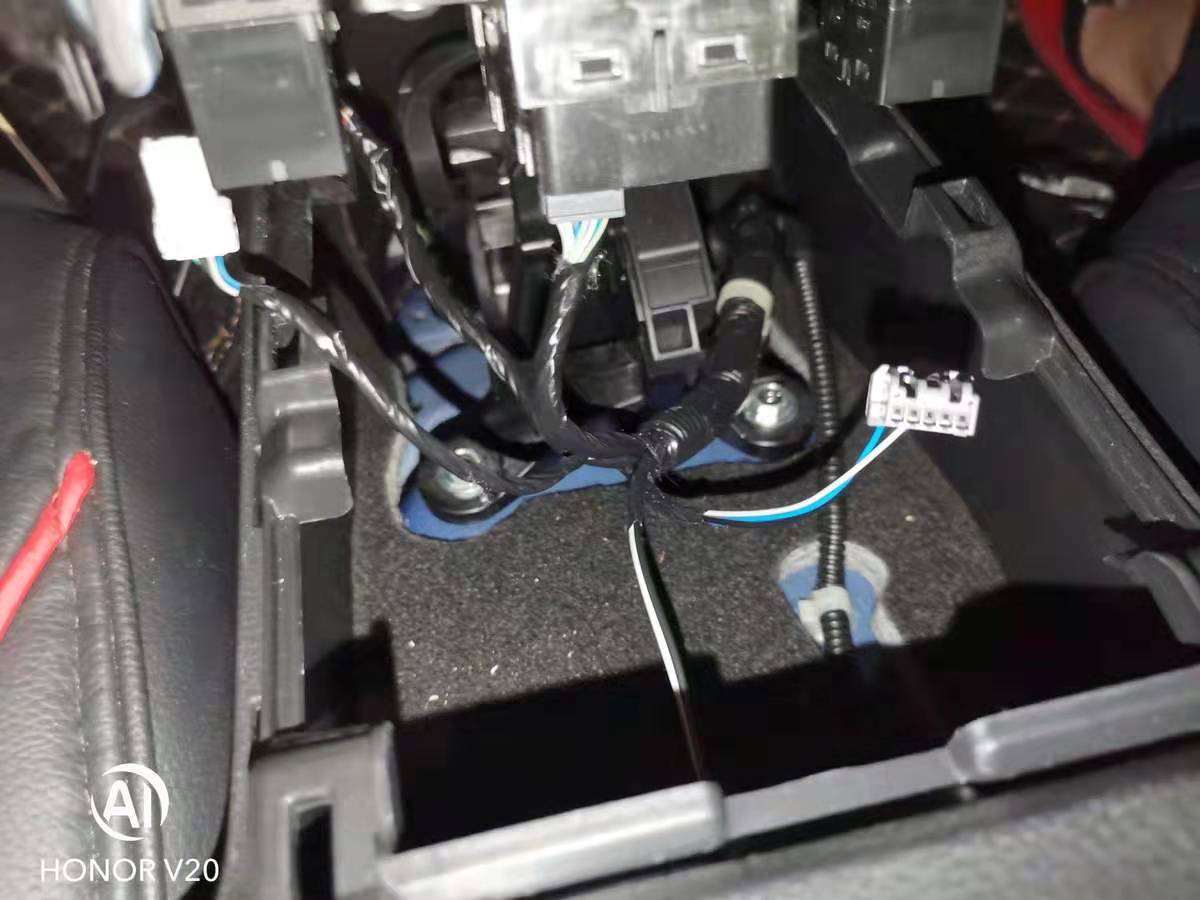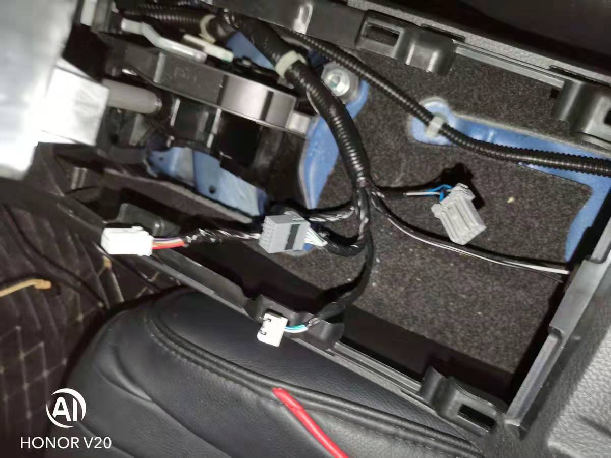 3、拆手扶箱的时候要注意点火感应接口,在档把前面的下面,横着螺丝固定在手扶箱的框上
