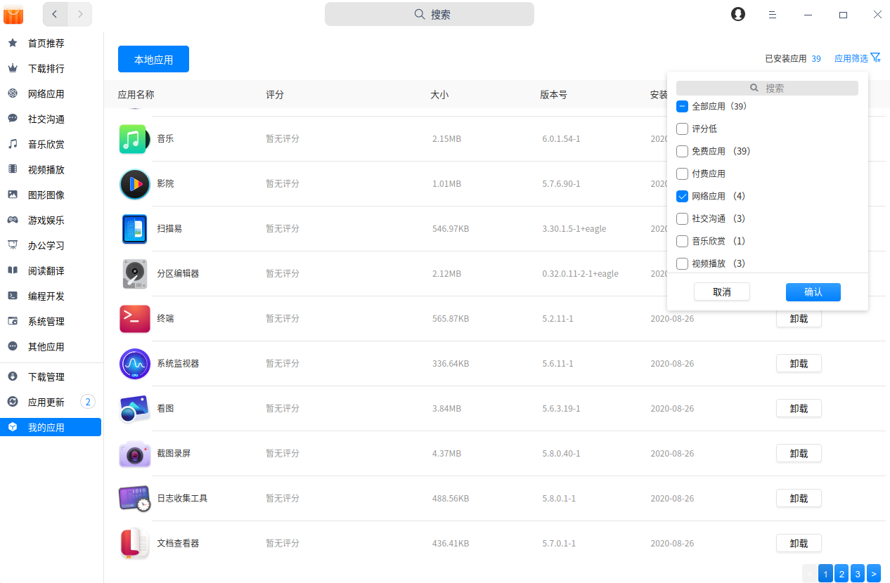 应用商店的不同类别应用,覆盖了生活、工作的主要使用场景,本次新增一键更新、应用筛选等功能,带来更便捷的应用管理体验,同时也兼容部分Wine应用,并达到原生应用的体验。